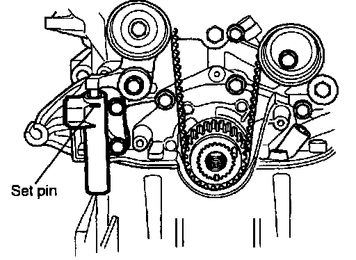 NOTE: At this time auto tensioner's set pin should be compressed and secured with set pin.