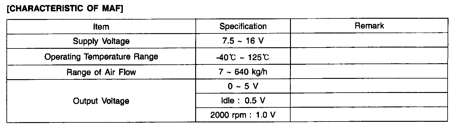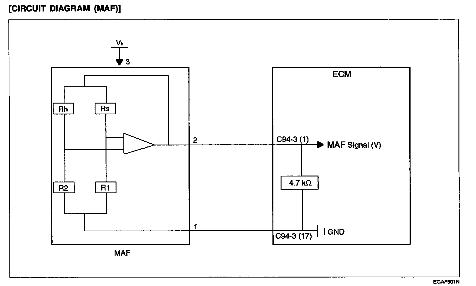 This hot film type Mass Air Flow (MAF) Sensor is composed of a hot film sensor, housing and metering duct (hybrid sensor element). Mass air flow rate is measured by detection of heat transfer from a hot film probe because the change of the mass air flow rate causes a change in the amount of heat being transferred from the hot film probe surface to the air flow. The mass air flow sensor generates a pulse so it repeatedly opens and closes between the 5 V voltage supplied from the ECM.