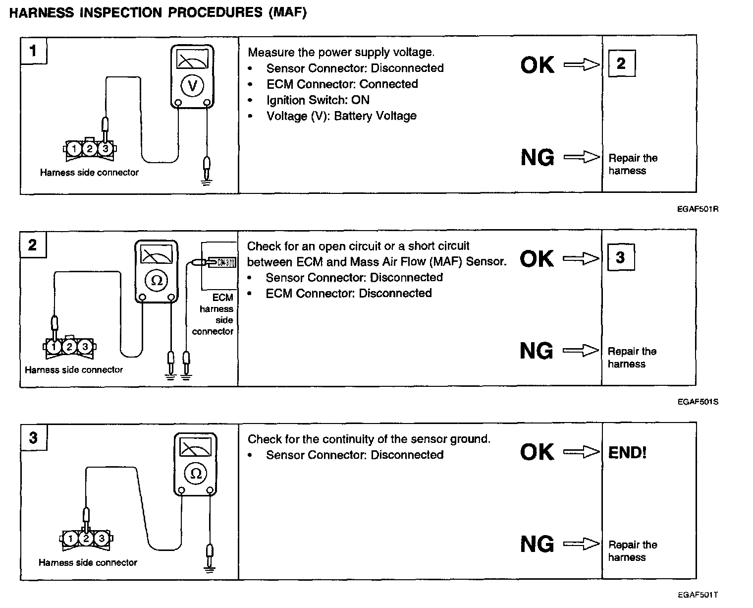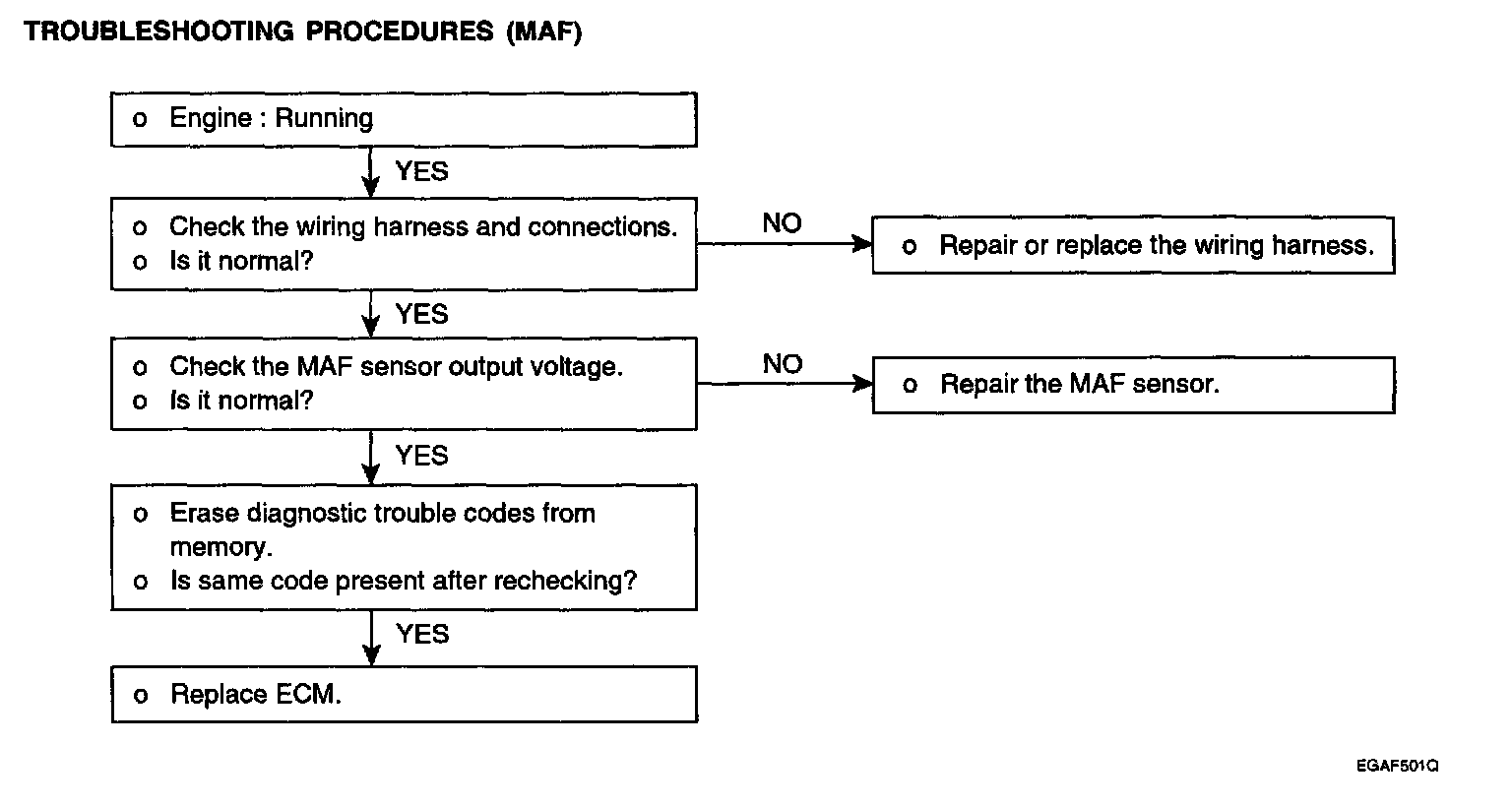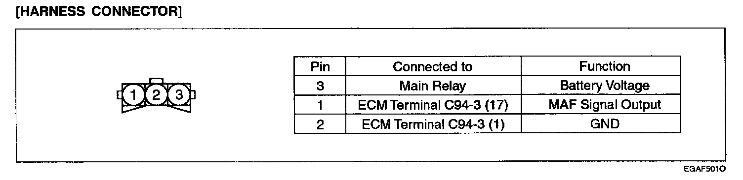 2. If the MAF sensor output voltage is other than 0 when the ignition switch is turned on (do not start the engine), check for a faulty MAF sensor or ECM.