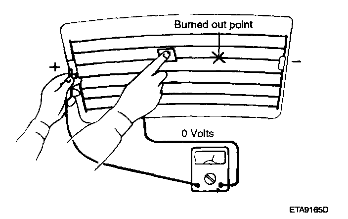 5. Use an ohmmeter to measure the resistance of each heater line between a terminal and the center of a grid line, and between the same terminal and the center of one adjacent heater line. The section with a broken heater line will have a resistance twice as that in other sections. In the affected section, move the test lead to a position where the resistance sharply changes.
