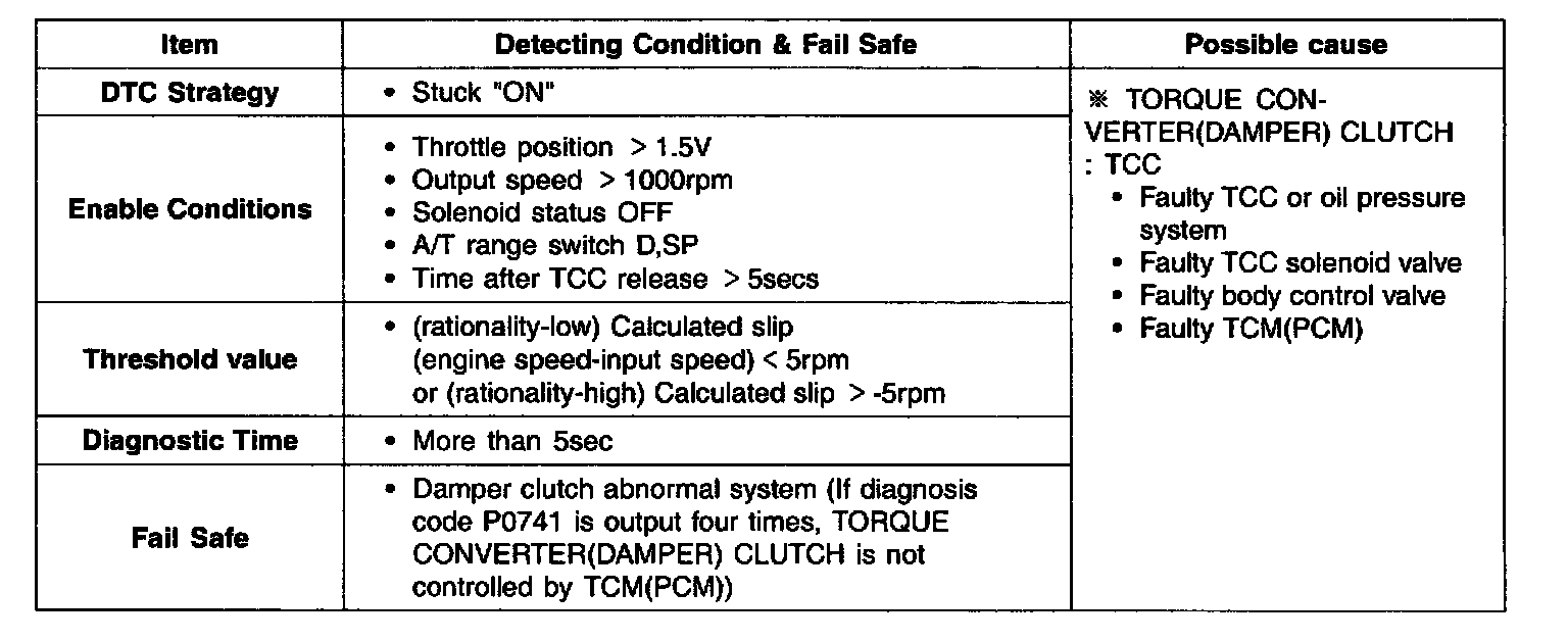 The PCM/TCM increases the duty ratio to engage the Damper Clutch by monitoring the slip rpms (difference value between engine speed and turbine speed). If a very small amount of slip rpm is maintained though the TCM applies 0% duty ratio value, then the TCM determines that the Torque Converter Clutch is stuck ON and sets this code.