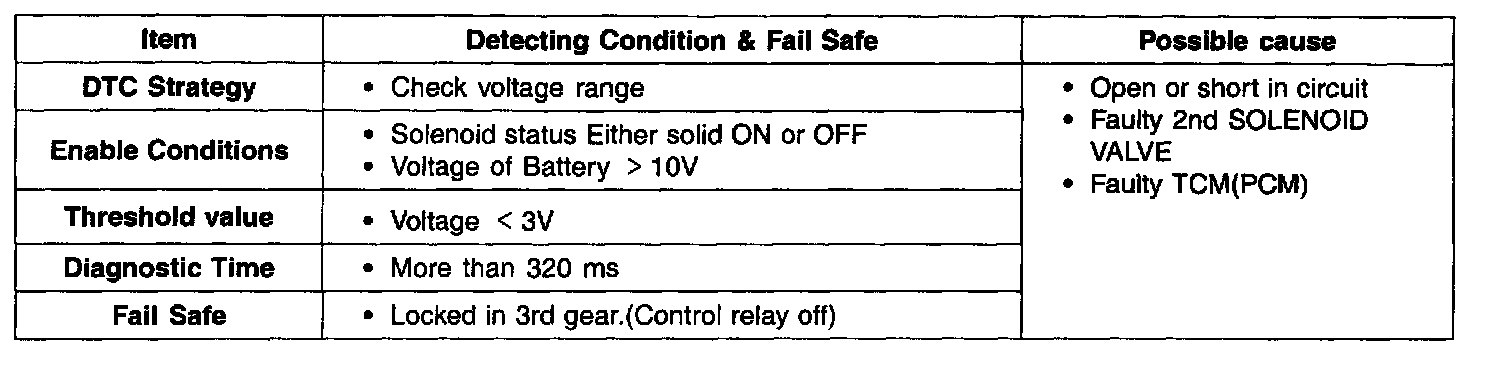 The TCM checks the Under Drive Clutch Control Signal by monitoring the feedback signal from the solenoid valve drive circuit. If an unexpected signal is monitored, ( For example, high voltage is detected when low voltage is expected or low voltage is detected when high voltage is expected) the TCM judges that 2nd Brake drive control solenoid circuit is malfunctioning and sets this code.