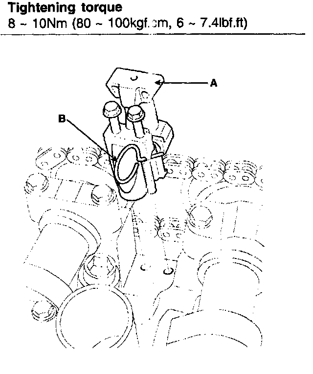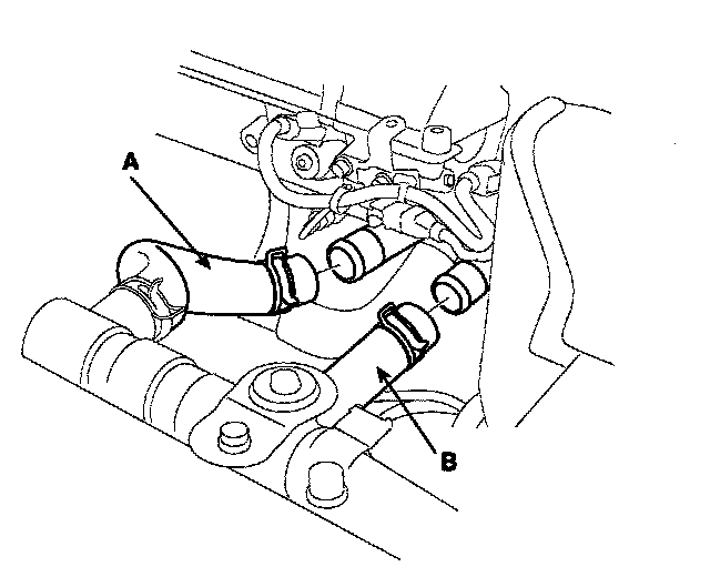 24. Install the upper radiator hose (A) and lower radiator hose (B).
