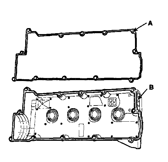 1) Install the cylinder head cover gasket (A) in the groove of the cylinder head cover (B).