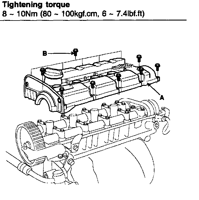 3) Install the cylinder head cover (A) with the 12 bolts (B). Uniformly tighten the bolts in several passes.