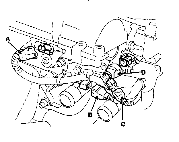 5) Four fuel injector connectors (B).