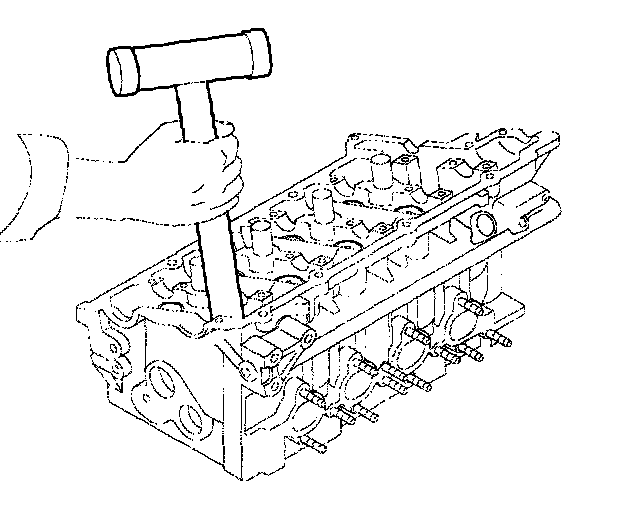 5) Lightly tap the end of each valve stem two or three times with the wooden handle of a hammer to ensure proper seating of the valve and retainer lock.