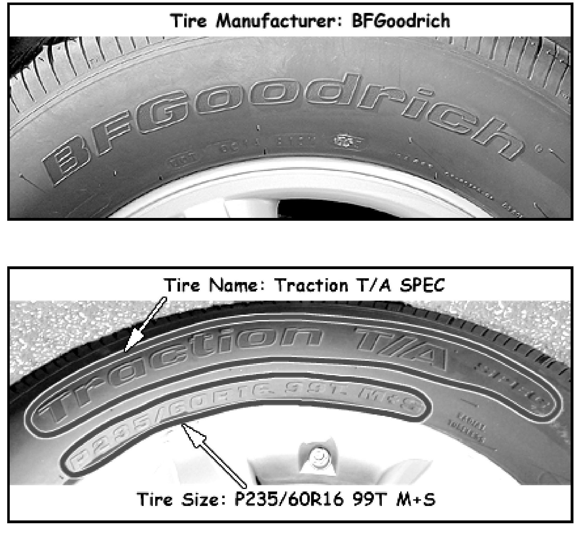 If inquiring about a P235/60R16 tire, you should provide the following types of information shown.