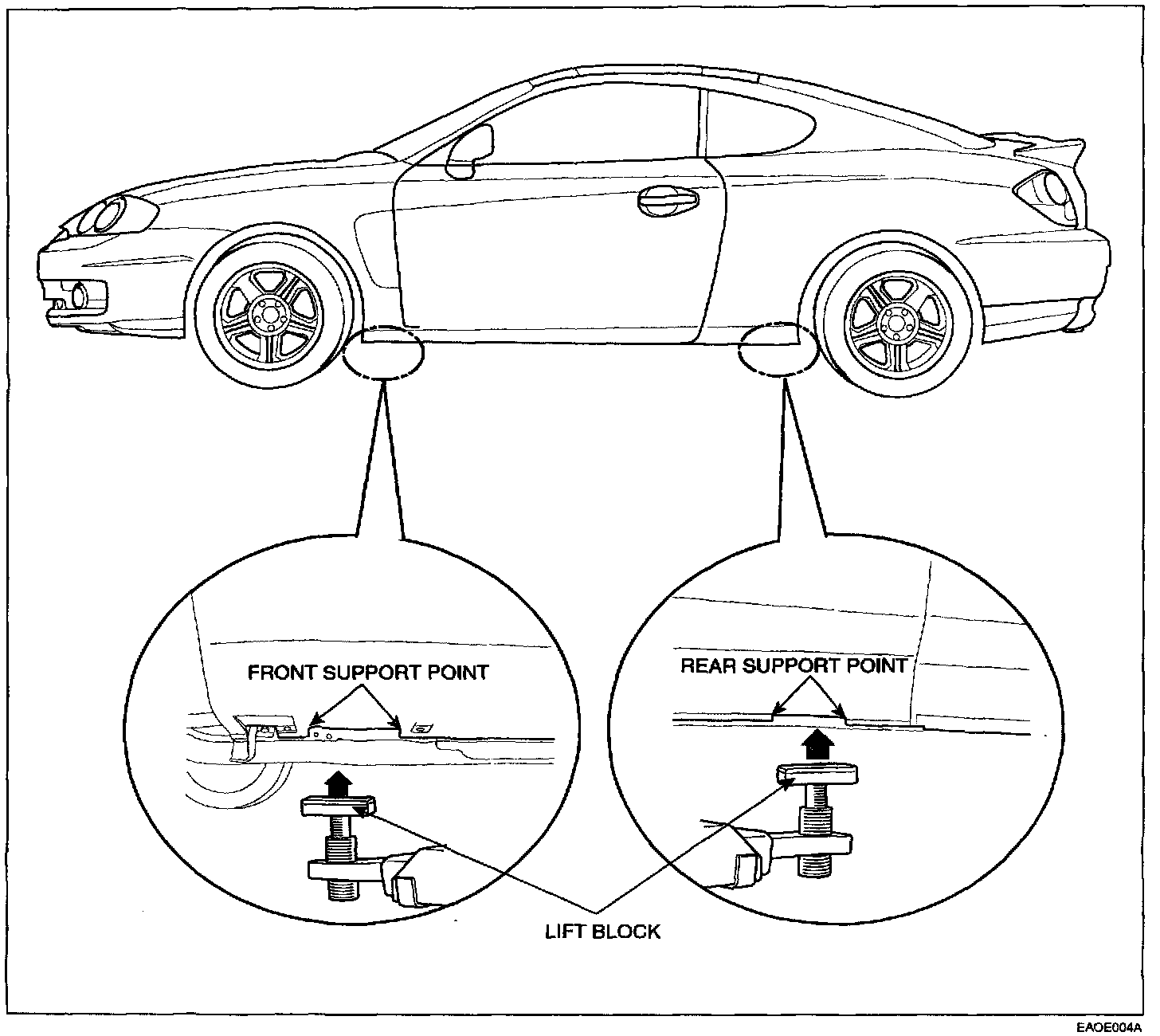 When heavy rear components such as suspension, fuel tank, spare tire, tailgate and trunk lid are to be removed, place additional weight in the luggage area before hoisting. When substatial weight is removed from the rear of the vehicle the, center of gravity may change and cam cause the vehicle to tip forward on the hoist.