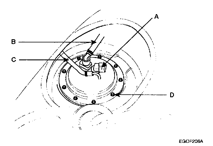 5. Unfasten the fuel pump assembly mounting bolts (D).