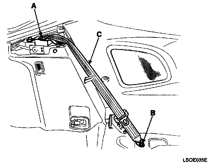 5. After loosening the lower anchor (B) mounting bolt, remove seat belt (C).