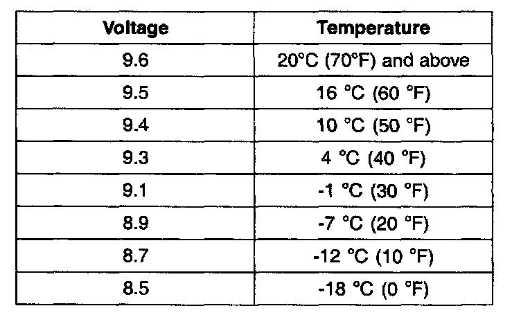e. Compare the voltage reading with the minimum and replace the battery if battery test voltage is below that shown in the voltage table.