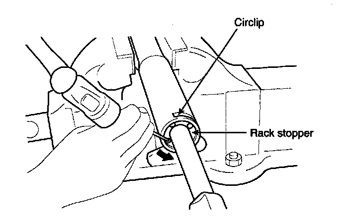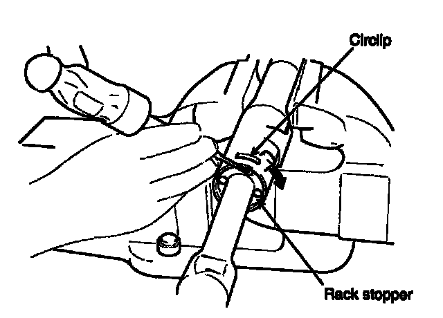 15. When the end of the circlip comes out of the notched hole of the housing rack cylinder, turn the rack stopper counterclockwise and remove the circlip.