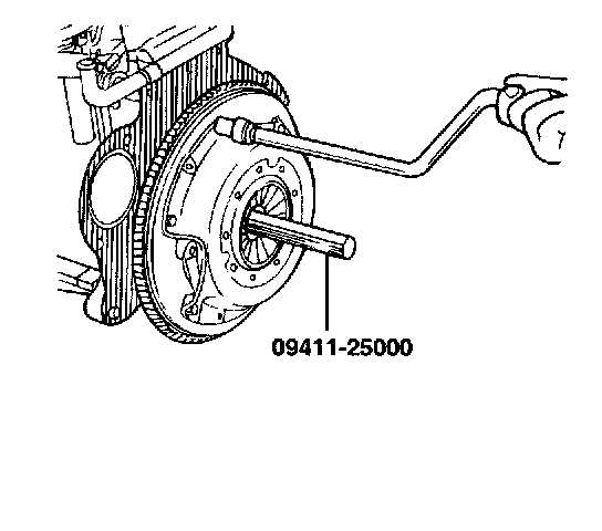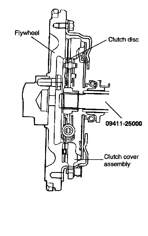 6. Using the special tool (09411-25000), install the clutch disc to the flywheel. When installing the clutch disc, be sure that the surface having the manufactures stamp is towards the pressure plate side.