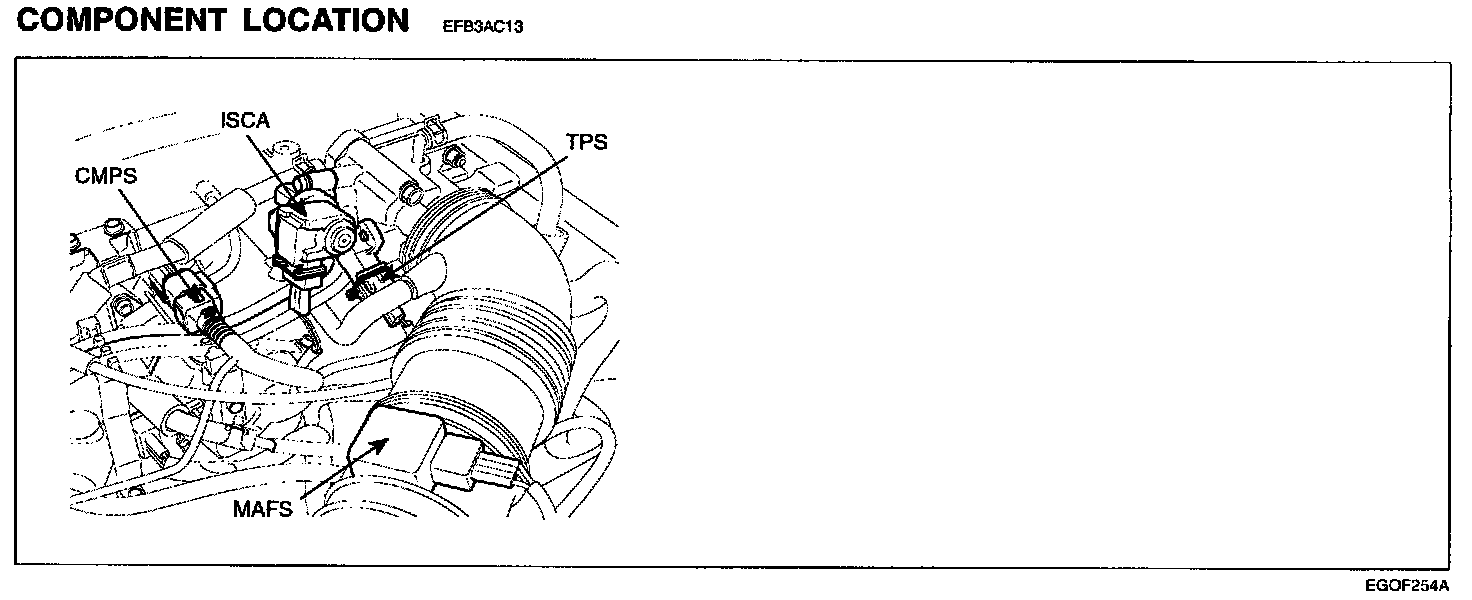 The Mass Air Flow Sensor (MAFS) is located between the air cleaner assembly and the throttle body. The MAFS uses a hot film type sensing element to measure the mass of intake air entering the engine. This hot film type air flow sensor consists of a hot film sensor, housing and metering ducts. Mass air flow rate is measured by detection of heat transfer from a hot film probe. The change in air flow rate causes change in the amount of heat being transferred from the hot film probe surface to the air. A large amount of intake air represents acceleration or high load conditions while a small amount of intake air represents deceleration or idle. The mass of intake air should increase at acceleration and be stable during constant engine speed. The ECM uses this information to determine the injection duration and ignition timing for the desired air/fuel ratio.