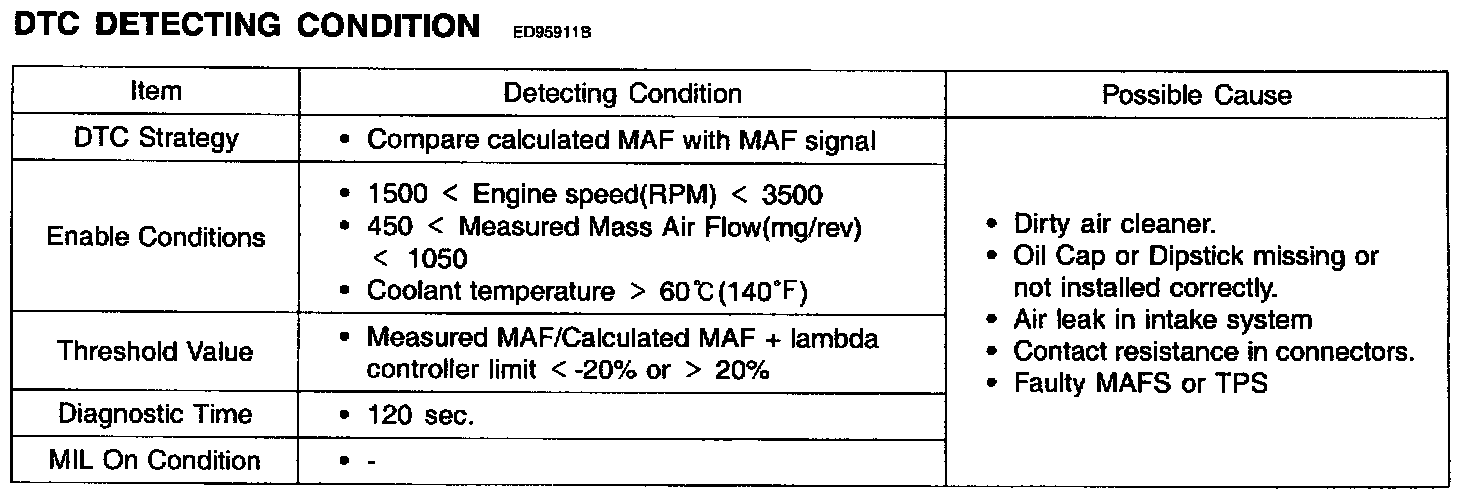 The ECM compares the actual measured Mass Air Flow signal to the modeled Mass Air Flow value and sets the DTC P0101 when the difference between these two value is too high or too low with lambda deviation in opposite direction.