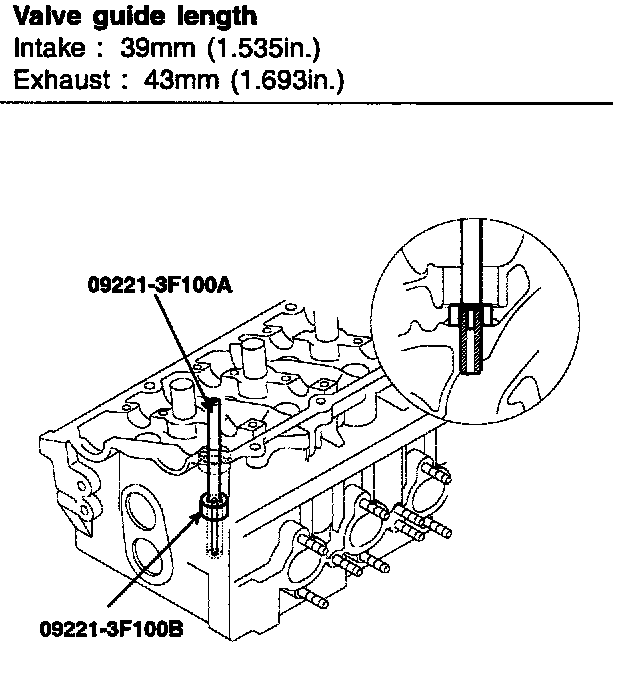 3. Using the SST (09221-3F100A/B), press-fit the valve guide. The valve guide must be press-fitted from the upper side of the cylinder head. Keep in mind that the intake and exhaust valve guides are different in length.