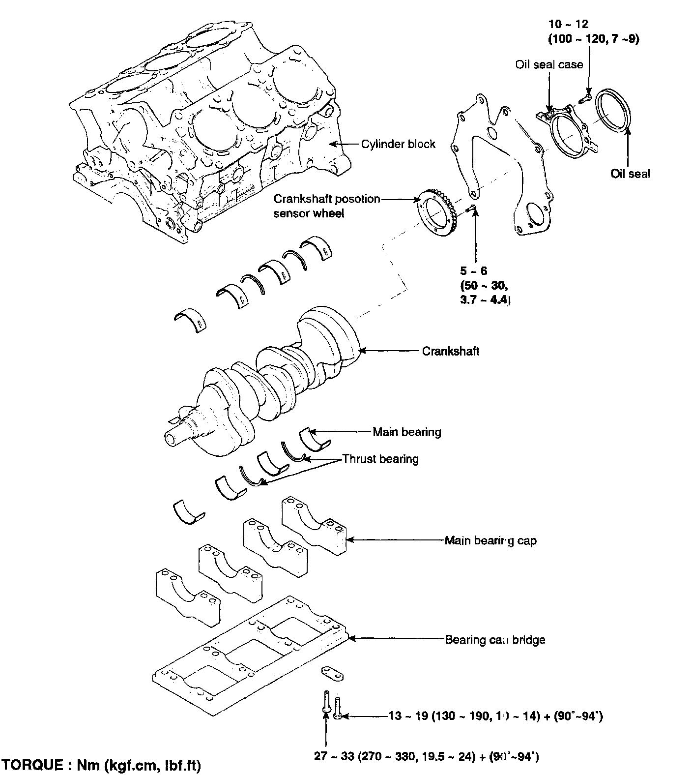 3) Retighten the bearing cap bolts by 90° - 94° in the numerical order shown.