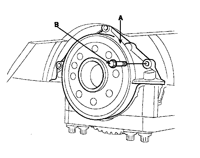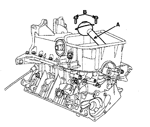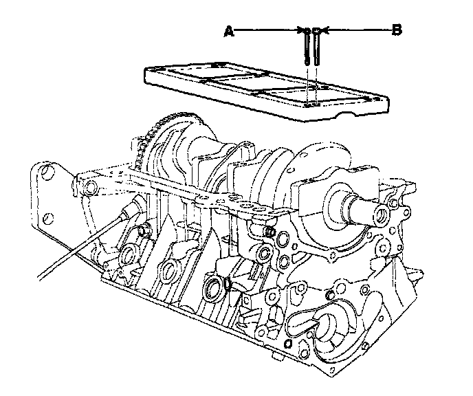 12. Remove oil screen. Remove the 2 bolts (B), oil screen (A) and gasket.