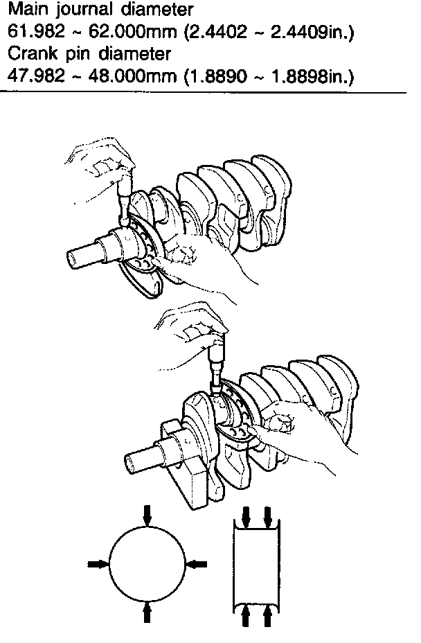 5. Inspect main journals and crank pins Using a micrometer, measure the diameter of each main journal and crank pin.