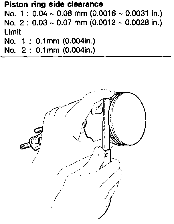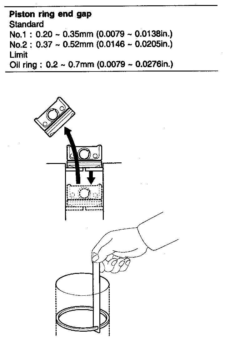 To measure the piston ring end gap, insert a piston ring into the cylinder bore. Position the ring at right angles to the cylinder wall by gently pressing it down with a piston. Measure the gap with a feeler gauge. If the gap exceeds the service limit, replace the piston ring. If the gap is too large, recheck the cylinder bore diameter against the wear limits, If the bore is over the service limit, the cylinder block must be rebored.