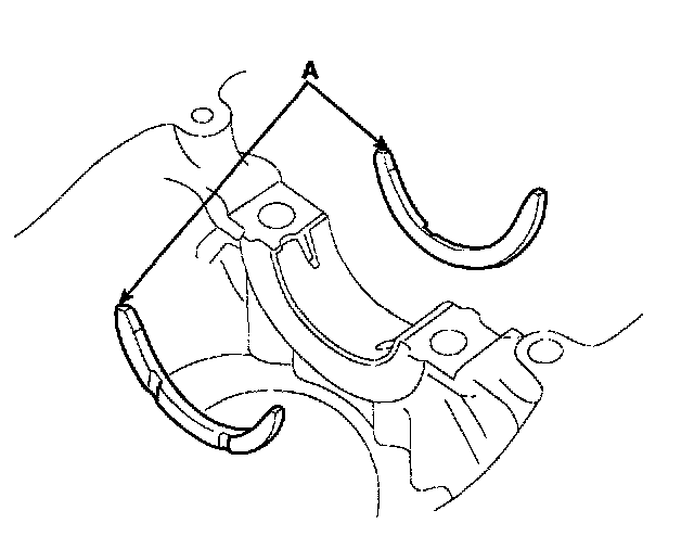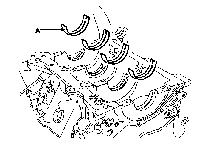 5. Install thrust bearings. Install the 2 thrust bearings (A) under the No.3 journal position of the cylinder block with the oil grooves facing outward.
