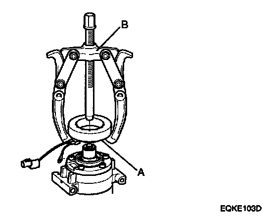 4. Remove the screw from the field coil ground terminal. Remove the field coil(A) from the shaft with a puller(B). Be careful not to damage the coil and compressor.