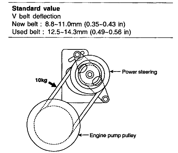 1. Press the V belt, applying a pressure of 98 N (10 kg, 22 lbs.) at the specified point and measure the deflection to confirm that it is within the standard value.