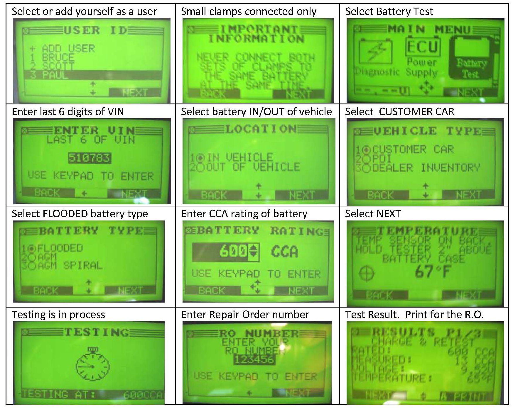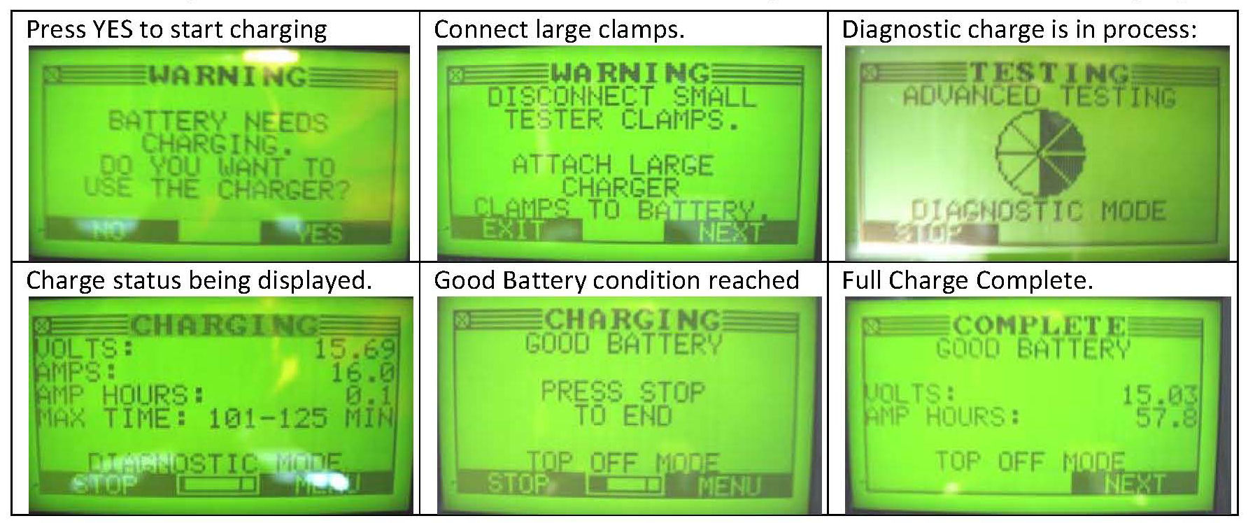 3. Follow these screen by screen instructions from left to right of each row. This example shows screens that will occur for battery condition of "Charge & Retest":
