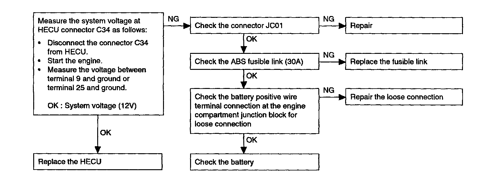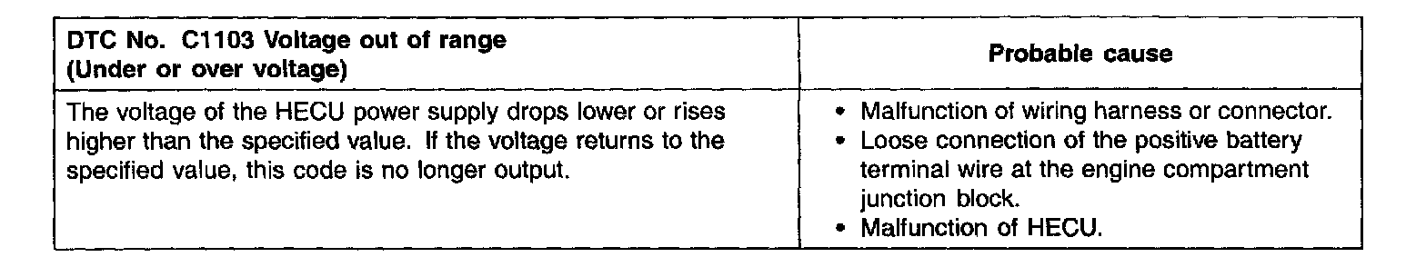 CAUTION: If the battery voltage drops or rises during inspection, the DTC C1103 will be output as well. If the voltage returns to the standard value, this code is no longer output. Therefore, before carrying out the following inspection, make sure the battery is fully charged.