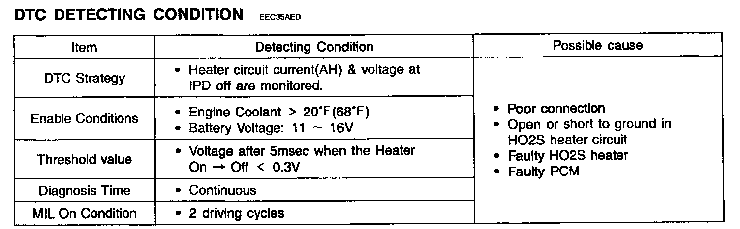 After the Heater is on from Off, the voltage after 5 msec is less than threshold value, the PCM determines that a fault exists and a DTC is stored.
