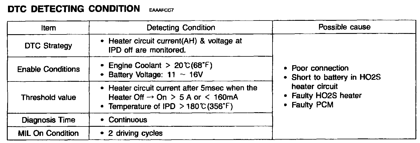 If the current of HO2S heater is out of the threshold value after the heater shifts from "OFF" to "ON", the PCM determines that a fault exists and a DTC is stored.