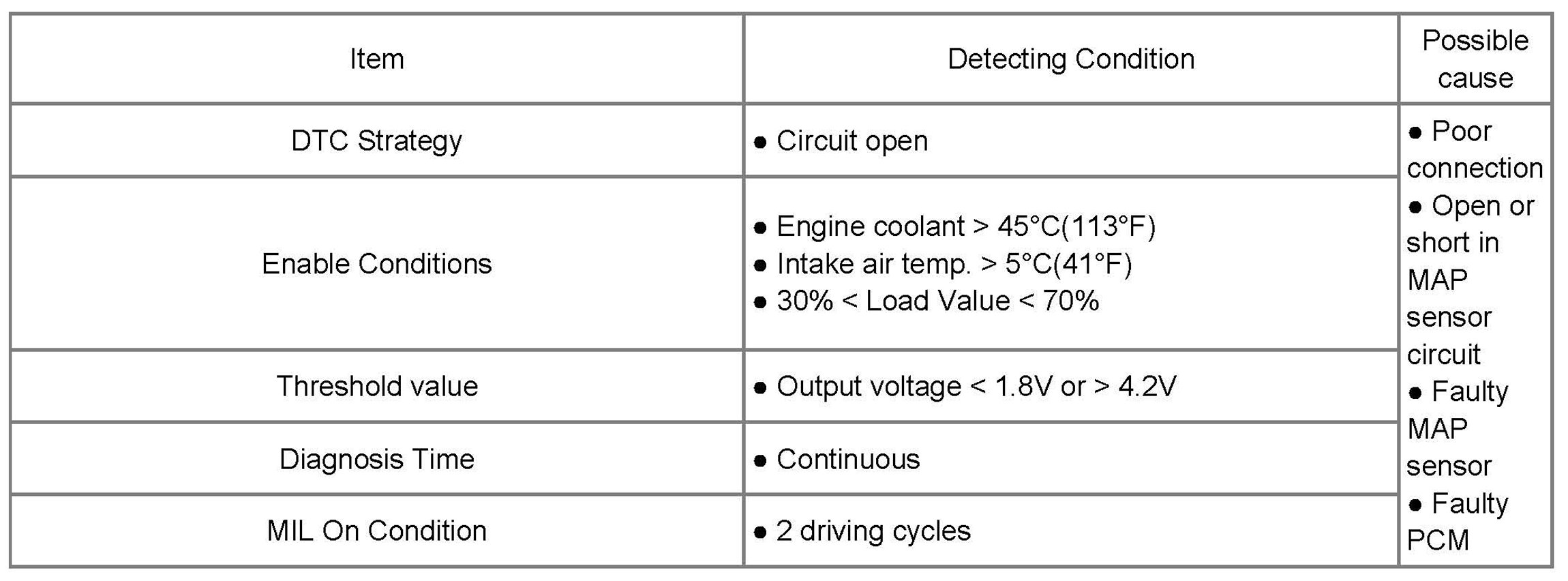 If MAP Sensor output voltage is out of the threshold value, the PCM determines that a fault exists and a DTC is stored.