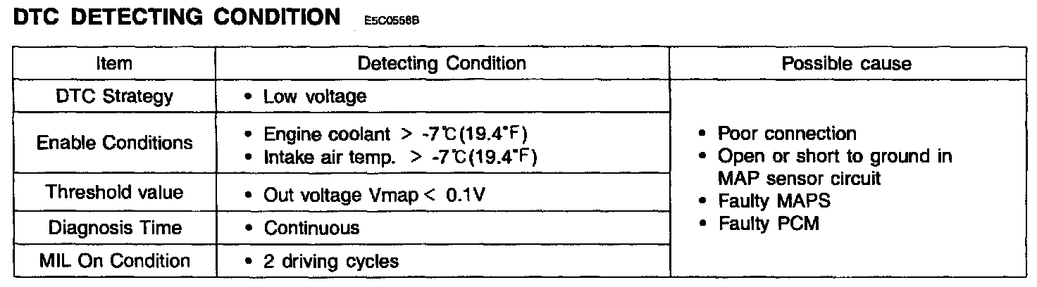 If MAP sensor output voltage is lower than threshold value, the PCM determines that a fault exists and a DTC is stored.