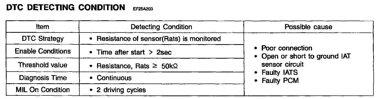 If IAT sensor output voltage is higher than 50 kOhm, the PCM determines that a fault exists and a DTC is stored.