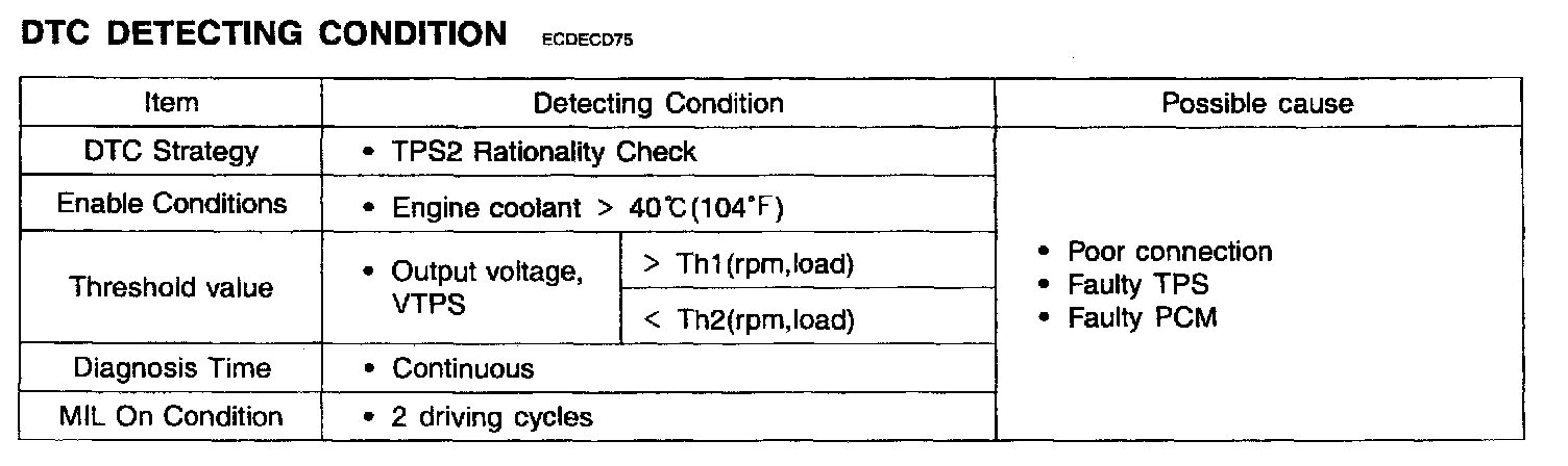 This DTC is set if the TPS output voltage is out of threshold value which is a function of engine speed and load.