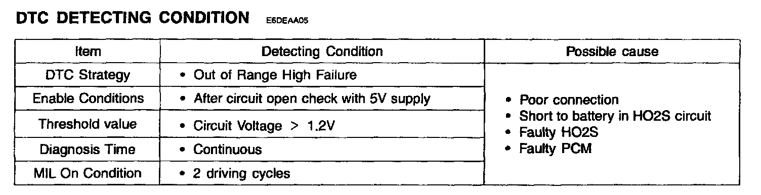 If HO2S signal voltage has continued to be higher than 1.2 volts after open circuit check, the PCM judged as a high voltage and DTC is set.
