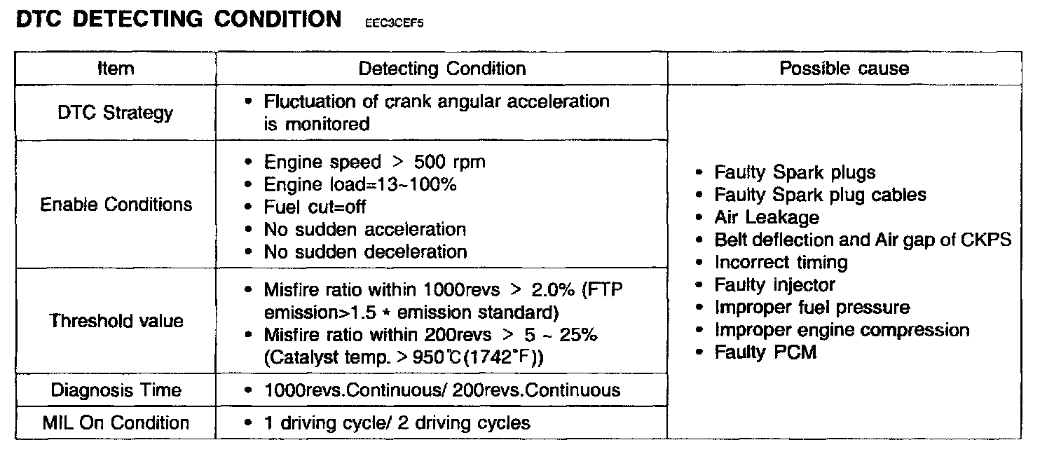 Misfires can be caused by lack of combustion in a cylinder due to absence of spark, poor fuel metering, poor compression, or many other causes. Even a small number of misfires may result in excessive exhaust emissions due to the unburned mixture. Increased misfire rates cause damage to the catalytic converter. The PCM monitors the crankshaft speed variation to determine if any misfiring generated. The PCM identifies the specific cylinder in which the misfire has occurred and counts individual misfire events by monitoring changes in the crankshaft rotation for each cylinder. A random misfire indicates two or more cylinders are misfiring.