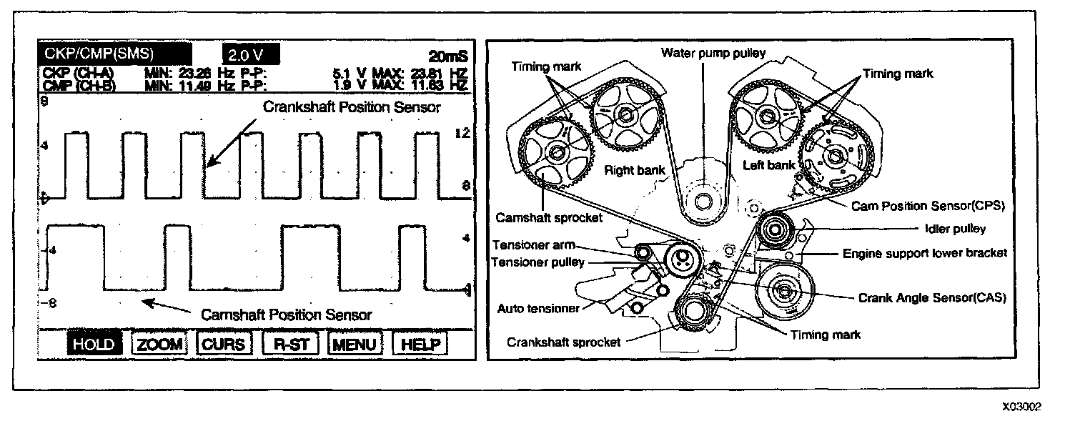 3. Monitor signal waveform from CAM and Crank shaft position Sensor are correctly in alignment.