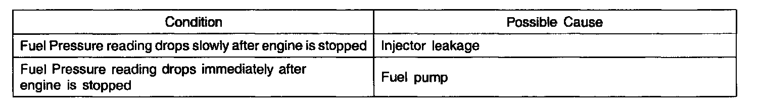 2. Stop the engine and check for a change in the fuel pressure gauge reading for 5 minutes.