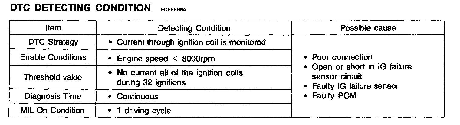 Ignition failure sensor is used to check whether the spark ignition is occurred correctly or not and also used to tachometer drive. The sensor monitors the voltage difference between a resistance which is on the battery circuit for ignition coil. When the ignition coil works properly, the electric current through the resistance is detected as voltage drop. This is confirmed for every ignition event with the crankshaft sensor and the camshaft sensor. If PCM detects a malfunction, no ignition is possible, so the engine would not start. If there is no ignition signal for a predetermined cycle for one or two ignition coils, an ignition coil circuit failure exists.