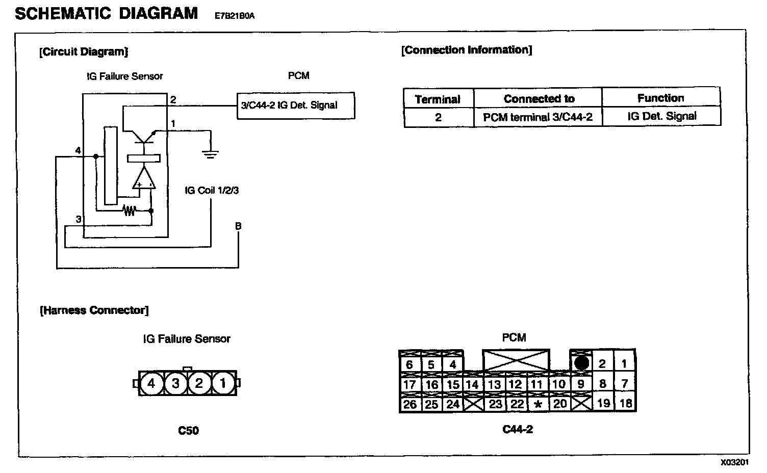 - Check open in harness between IG failure sensor connector and PCM connector.