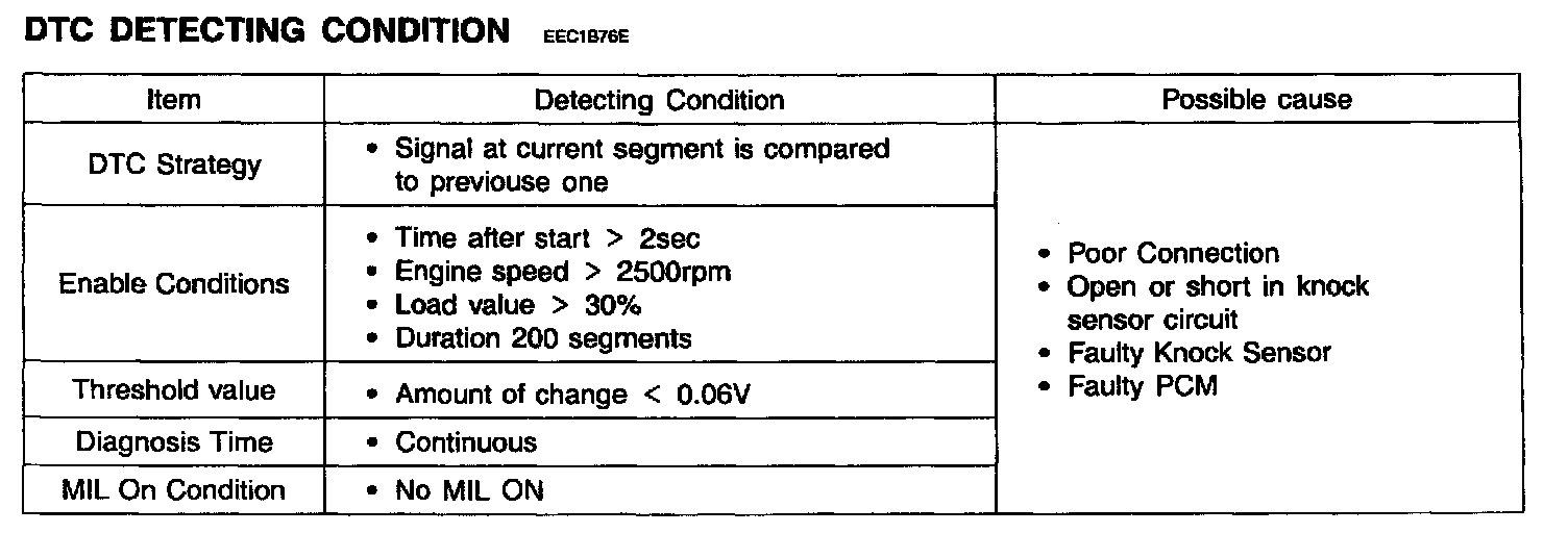 If there is little change in knock sensor's signal, the PCM determines that a fault exists and a DTC is stored.