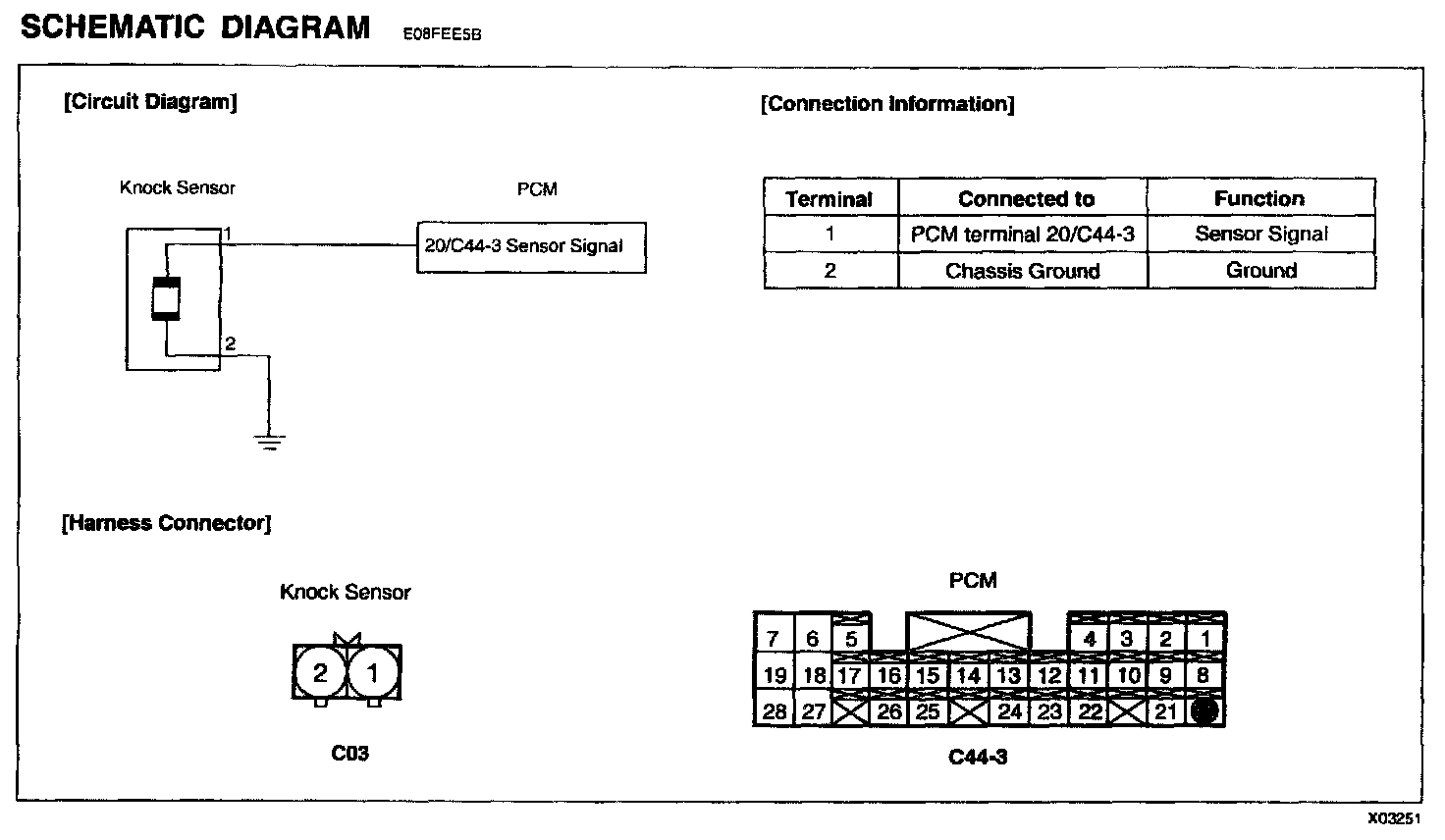 Knocking is a phenomenon characterized by undesirable vibration and noise and can cause engine damage. The knock sensor (KS) is attached to the cylinder block and senses engine knocking. A knocking vibration from the cylinder block is applied as pressure to the piezoelectric element. The knocksensor (KS) detects vibration upon increase and decrease in engine RPM and generates a voltage based on this vibration. The PCM controls the ignition timing based on the amplitude and frequency of the knock sensor signal. For example, if engine knocking occurs, the ignition timing is retarded to suppress it.