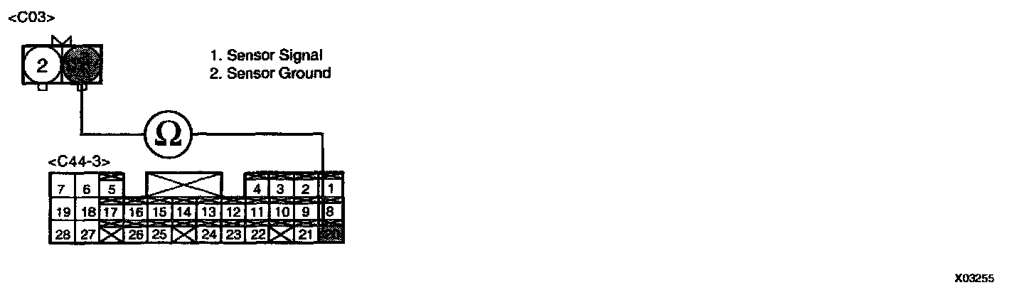 3. Measure resistance between terminal 1 of knock sensor harness connector and terminal 20/C44-3 of PCM harness connector.