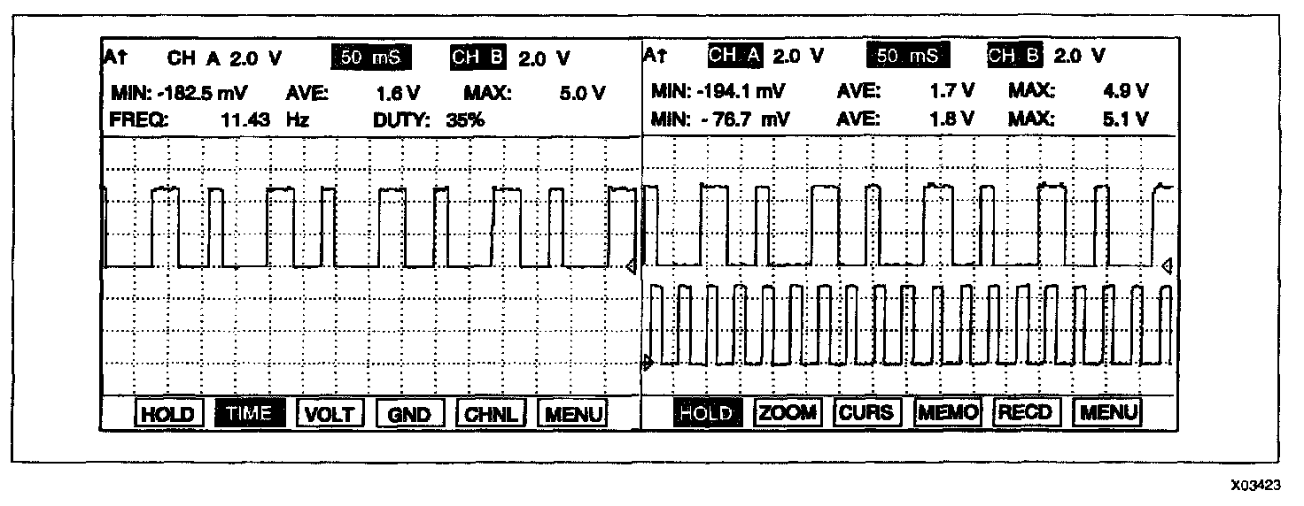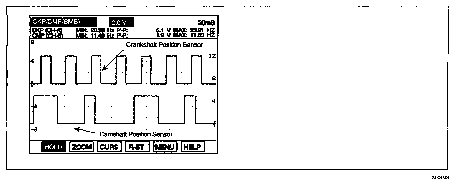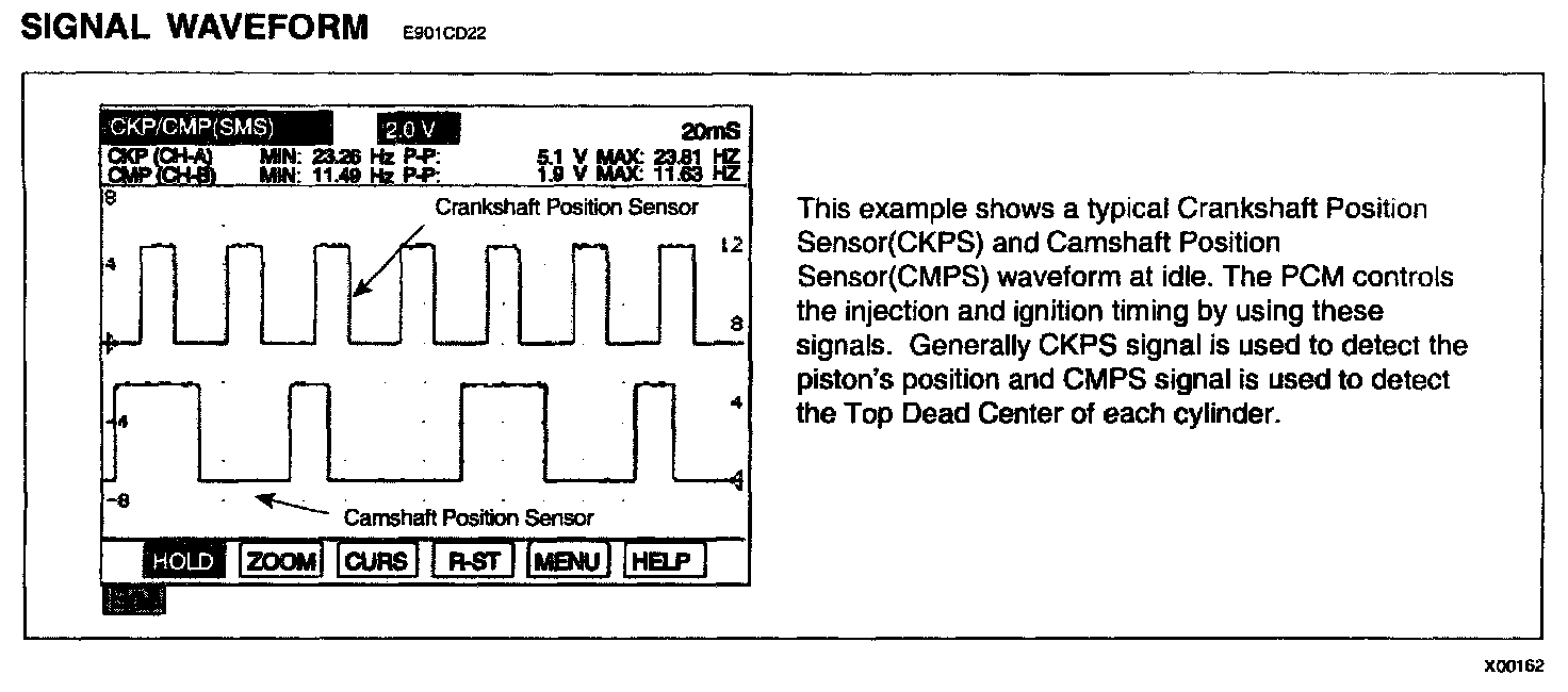 3. Check the signal waveform of CMPS on scantool. Check whether the waveform is synchronized with Crankshaft Position Sensor or not.