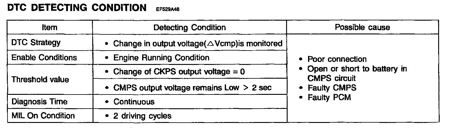 If the output voltage of CMPS remains high when the change of CKPS output voltage is zero, the PCM determines that a fault exists and a DTC is stored.
