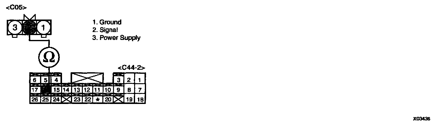 3. Measure resistance between terminal "2" of CMPS harness connector and terminal "16/C44-2" of PCM harness connector.