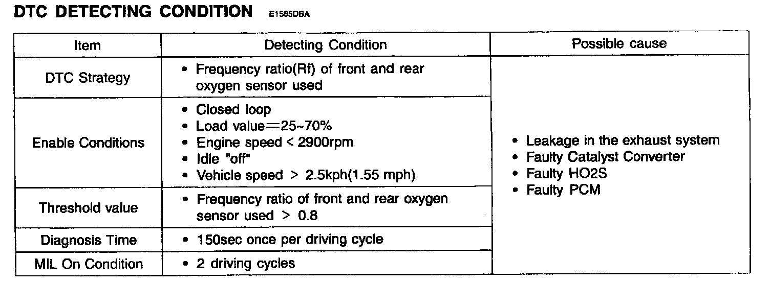 If the frequency ratio of front and rear HO2S is higher than threshold value, the PCM determines that a fault exists and a DTC is stored.