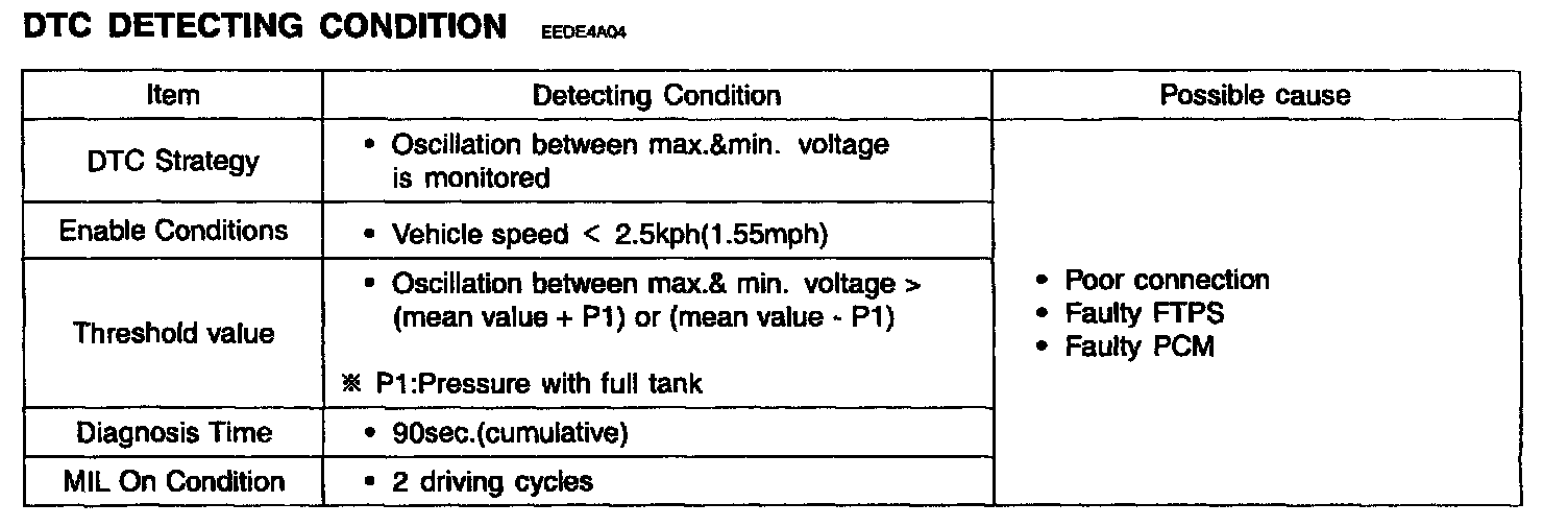 If the amplitude of fuel tank pressure's signal is out of the threshold value, the PCM determines that a fault exists and a DTC is stored.